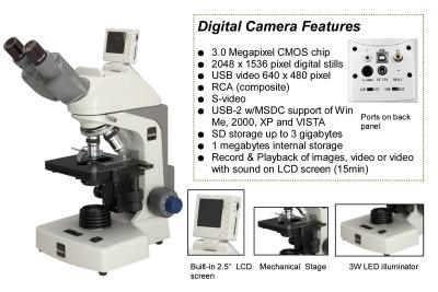 This is the high performance compound microscope with built-in digital camera as well as the excellent optics and reliable mechanisms designed for those who are engaged in the fields of medical, veterinary and scientific research. It is no more an option but a standard feature to take pictures, save images and transmit images to TV monitor and PC. The CSD-DL series offers three ways of observation, through eyepieces, on built-in LCD screen and on external monitors.